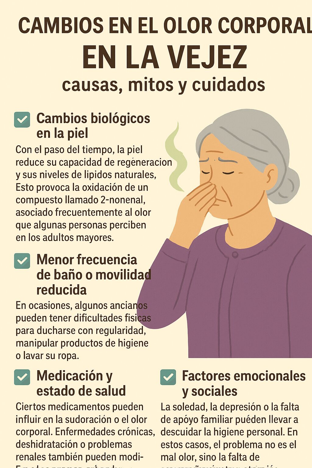 El olor corporal en la vejez no debe ser motivo de burla ni estigmatización. Es un fenómeno natural influenciado por cambios químicos, salud y condiciones de vida, no una característica inherente a las personas mayores. La mejor respuesta ante estos cambios es la comprensión, el cuidado y el respeto.