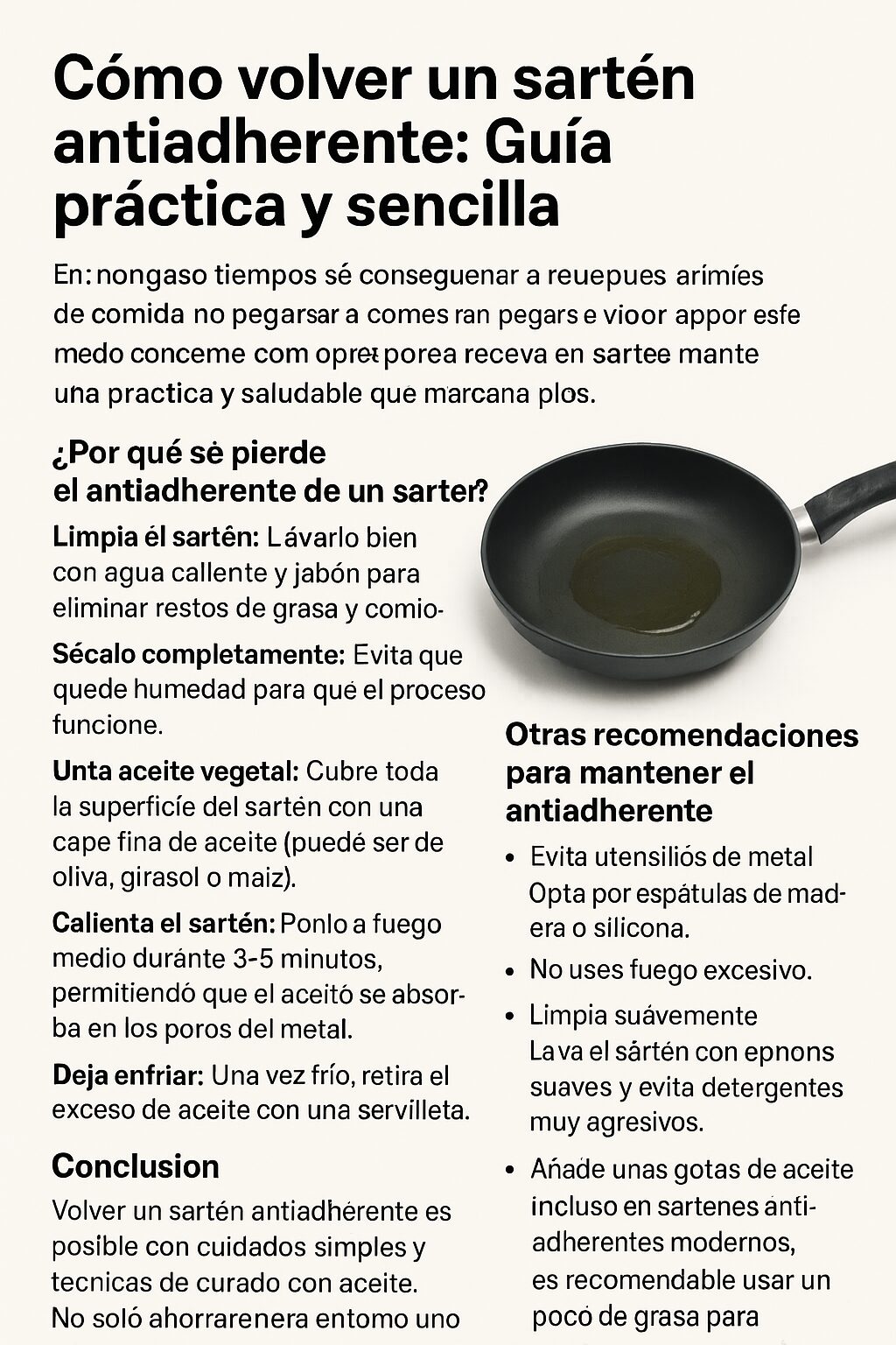 Volver un sartén antiadherente es posible con cuidados simples y técnicas de curado con aceite. No solo ahorrarás dinero evitando comprar uno nuevo, sino que también podrás disfrutar de una cocina más práctica y saludable. Mantener tus sartenes en buen estado depende de pequeños hábitos que marcan la diferencia a largo plazo.