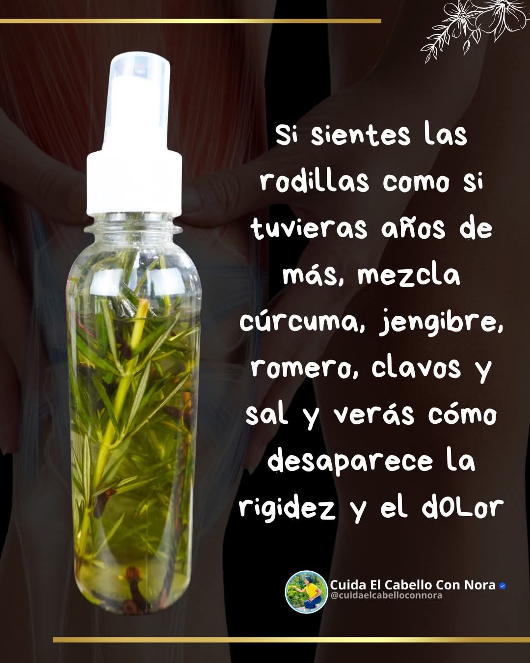 Si sientes las rodillas como si tuvieras años de más mezcla cúrcuma , jengibre , romero , clavos y sal y verás cómo desaparece la rigidez y el d010r La cúrcuma desinflama las articulaciones gracias a la curcumina, el jengibre alivia el dolor muscular, el romero mejora la circulación y relaja los tejidos, los clavos de olor aportan efecto analgésico natural y la sal ayuda a descomprimir la tensión articular.